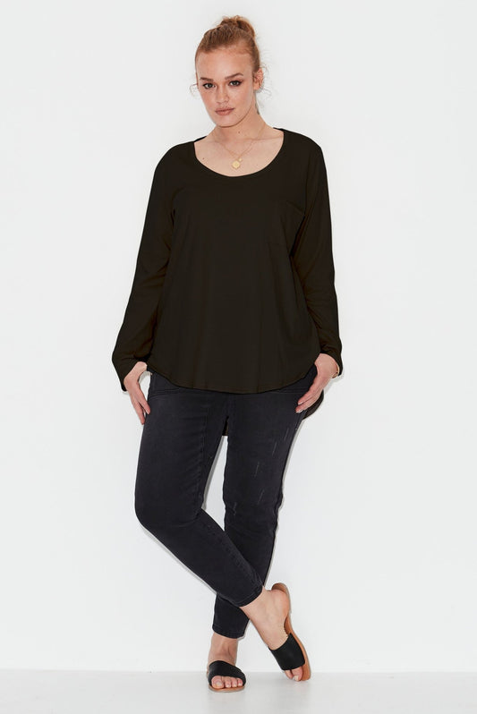 Linen Long Sleeve Longline Tee - Black